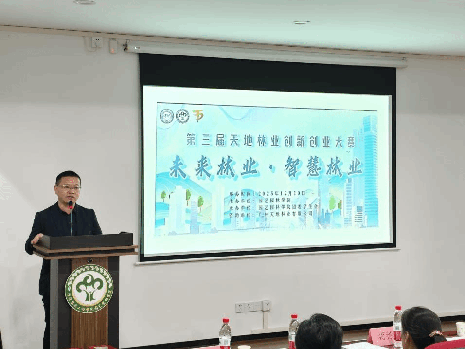 为深化校企合作,培养学生创新精神,12月10日上午,园艺园林学院在白云校区生命科学大楼B栋604举行——“未来林业 智慧林业”第三届天地林业创新创业大赛。广州市天地林业有限公司总经理罗丹、综合技术部经理蒋芳亲临现场,园艺园林学院党委书记陈晓玲、副书记王红山出席本次活动。本次大赛由广州天地林业有限公司总经理罗丹、综合技术部经理蒋芳、园艺园林学院草业科学系韩瑞宏教授、余晓华副教授及风景园林系王敏博士担任评委。