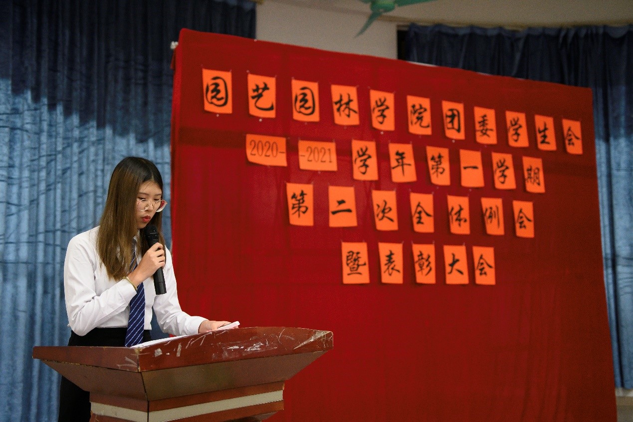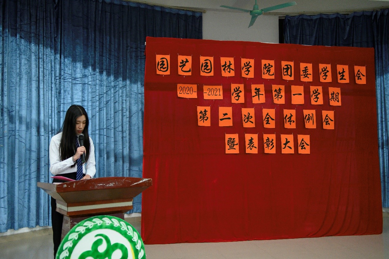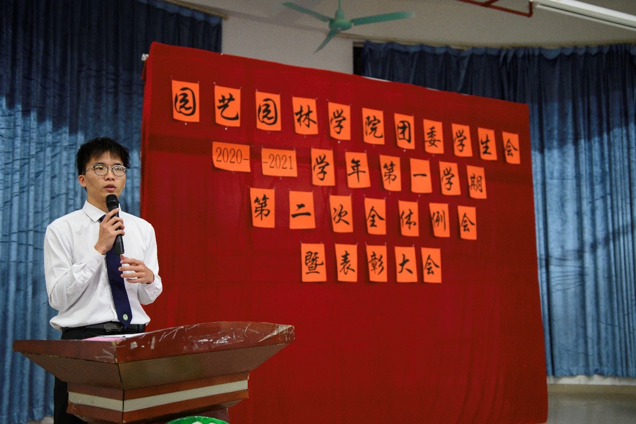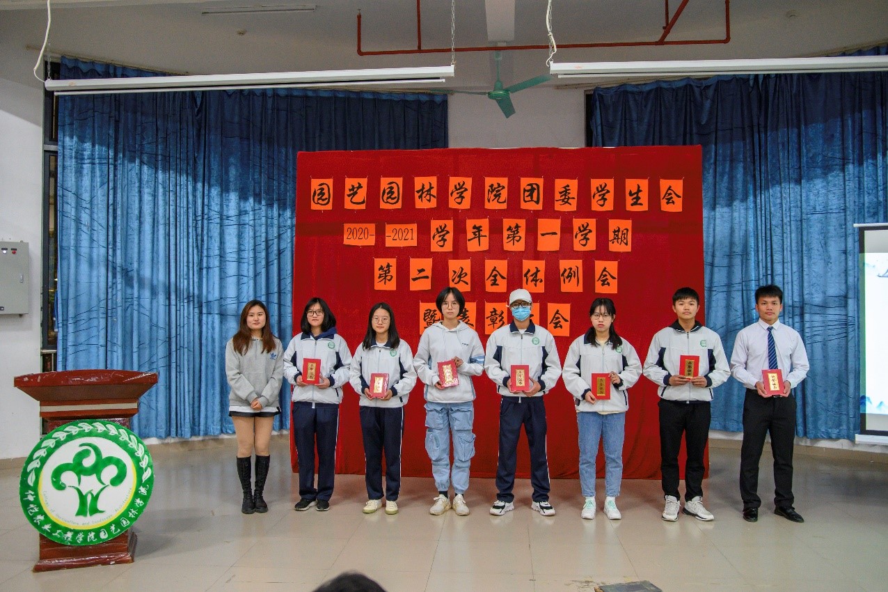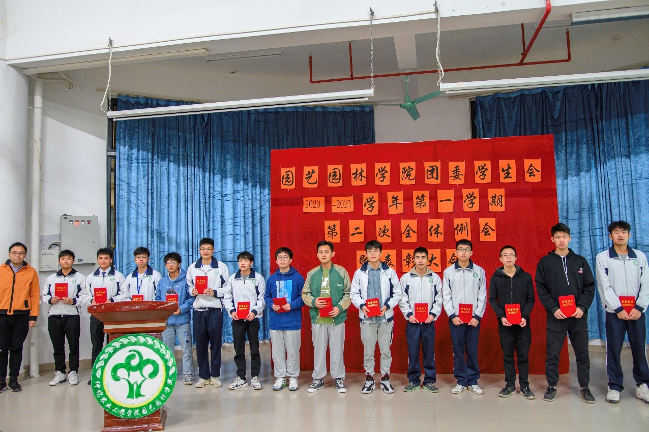 为表彰运动会获奖运动员、总结团委学生会一学期以来的工作情况,园艺园林学院于1月5日晚在白云校区D1小礼堂召开团委学生会2020年-2021学年第一学期第二次全体例会暨表彰大会。辅导员李剑峰、聂恺阳,团委第一副书记吴红霏,第二副书记罗泽彬、黄梓潆,学生会执行主席纪悦,青协执行会长周晓梦及校学生会代表和校团委代表出席本次会议,我院团委学生会全体干部以及校运会、院运会获奖同学参加本次会议。