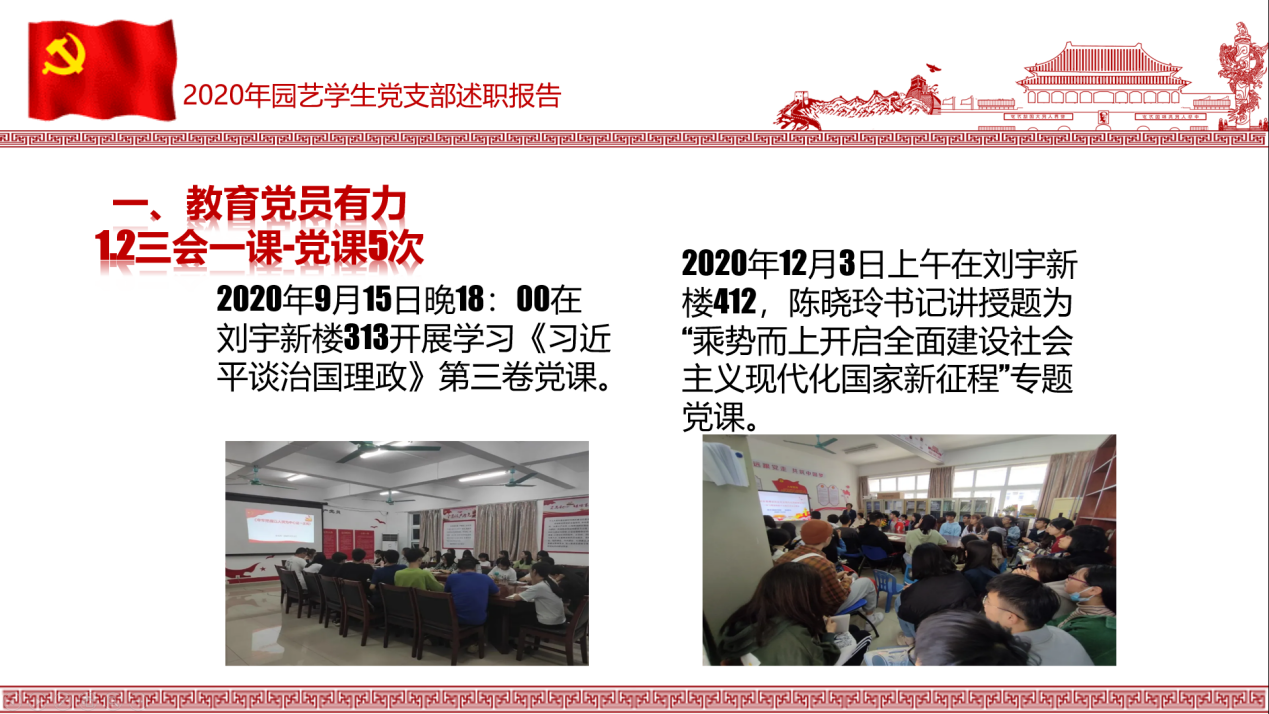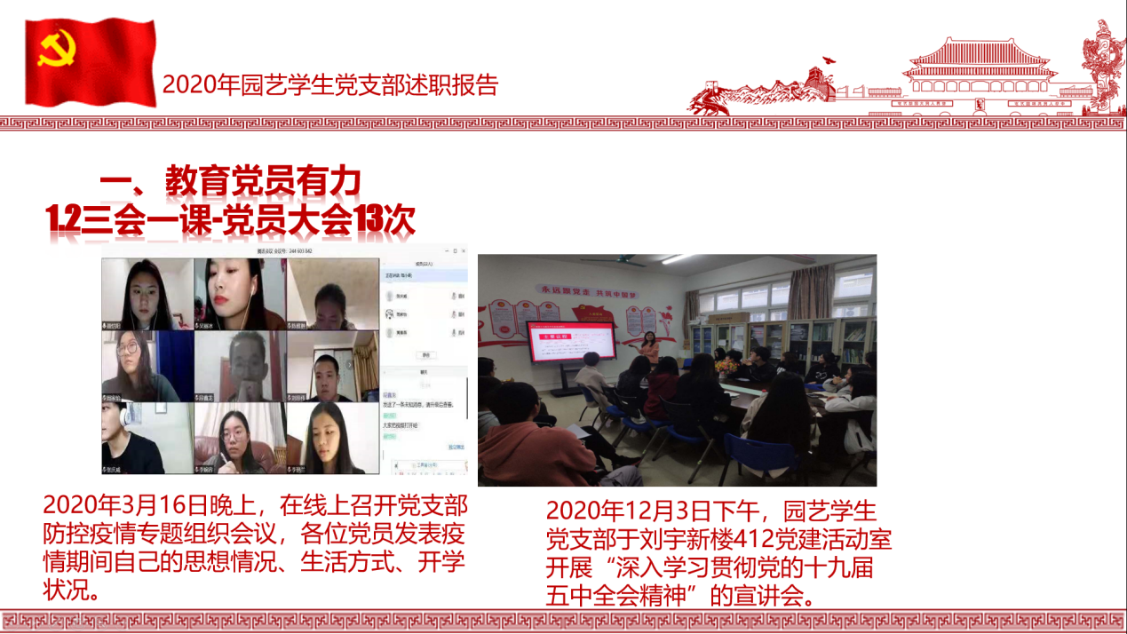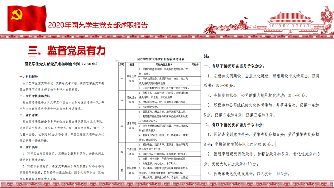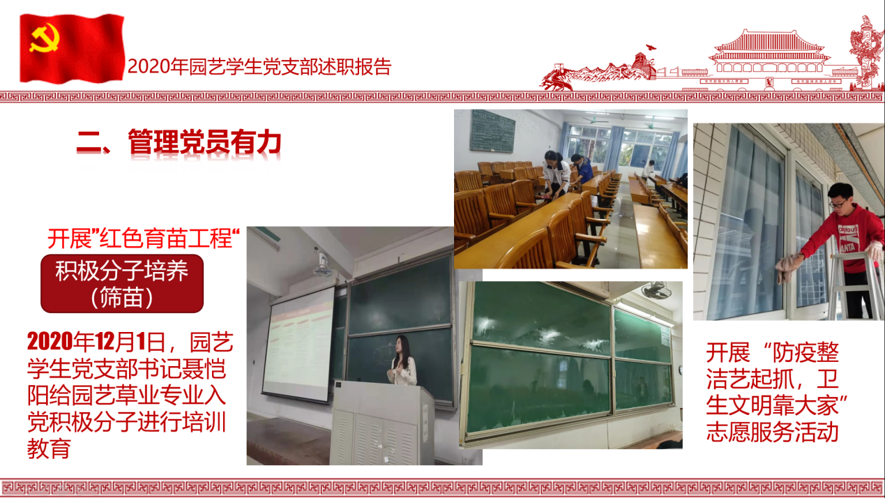 为提高学生党员的党性修养,加强自身学习意识,巩固支部建设工作,1月13日晚19:30,园艺学生党支部开展红色育苗工程之党员监督考核。