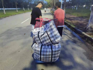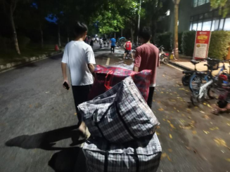 党员志愿者从院办和外院共借得4辆小推车,用于搬迁宿舍的物品。各宿舍有序将已打包好的东西拿到走廊,党员、积极分子积极遵守搬运时间表,错开时间,按照秩序,避免了在搬运过程中杂乱无章。整个搬运过程,女生主动帮助男生照看包裹,还有的女生帮助男生拿包裹上楼,并且自己搬完的同学主动帮助其他没有搬完的同学。同学们克服了路程远、工程施工、路面湿滑等困难,互相帮助、互相关心,顺利搬迁至1栋。
