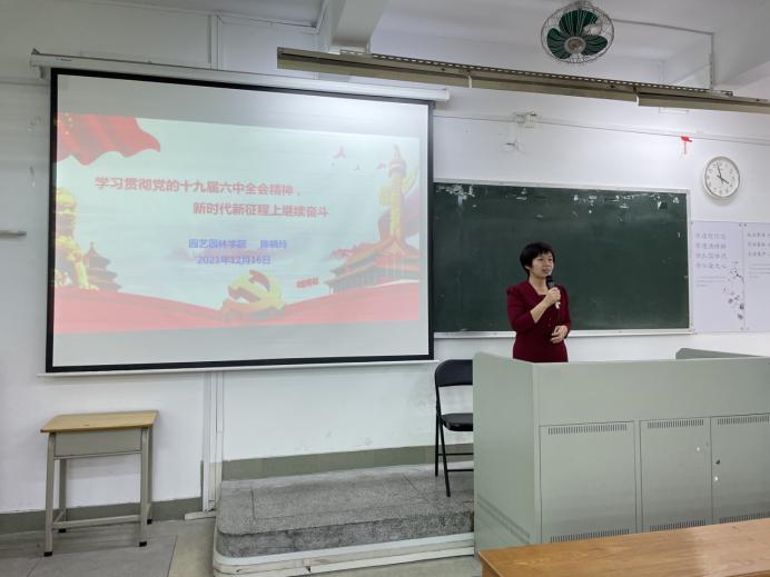 学院党委书记陈晓玲作题为“学习贯彻党的十九届六中全会精神,新时代新征程上继续奋斗”的辅导报告。陈晓玲分别从以下三个方面解读党的十九届六中全会精神:一是深刻认识《中共中央关于党的百年奋斗重大成就和历史经验的决议》的重大历史意义,从中汲取前进的智慧和力量;二是准确把握全会精神实质,把思想和行动统一到党中央决策部署上来;三是贯彻落实党的十九届六中全会精神,以学校的十四五规划为目标,扎实推进学院高质量发展,在新时代新征程上奋进作为。